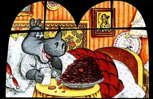 Сказка Дональда Биссета «Носорог и добрая фея» описывает средство спокойно спать ночами, прожевав и запив молочком сотню шоколадных печений. Сэм окружающими жителями считался крайне непочтительным животным – он каждую ночь будил соседей падением с кровати. Падал же он по причине, и ему самому неизвестной. Заснув как обычно после съедания двух полусотен печенек с вкуснейшей шоколадной начинкой, запитых стаканом молока, носорог долго ёрзал по кровати…