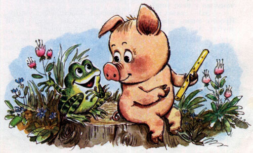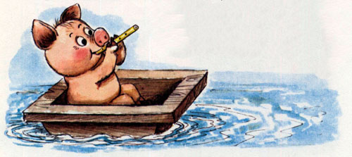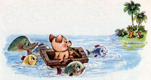 Пришёл он тут к реке и стал искать лодочку. Искал, искал, а лодочки нет. И вдруг видит корыто. В нём старушка бельё полоскала. Да оставила. Шлёпнулся поросёнок в корыто, загудел в дудочку и поплыл.