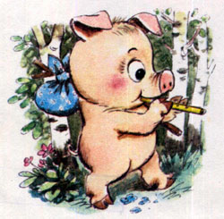 Взял поросёнок мешочек, взял дудочку и пошёл. Идёт себе по лесу, а чтобы не скучно было, в дудочку дудит.