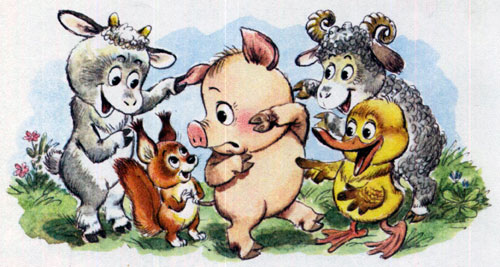 Сказка Цыферова «История про поросёнка» с картинками - описывает хитроватого поросёнка, нашедшего способ защитить себя от обид. Поросёнок был такой хорошенький – розовый, чистенький, толстенький, на коротких толстеньких ножках! Как такого не пощекотать, не боднуть, не толкнуть? А посмотреть, как поросёнок на шутку обижается – отдельный номер! Надоели поросёнку насмешки да толчки дружеские – пошёл он прочь со двора, прихватив вещичек узелок и дудочку…