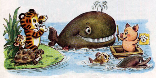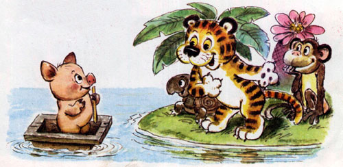 Наверное, поросёнок и пожил бы там ещё, но тут почему-то его вновь потянуло на родину. Взял поросёнок письмо от тигра, сел в корыто и поплыл.