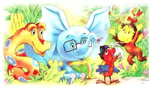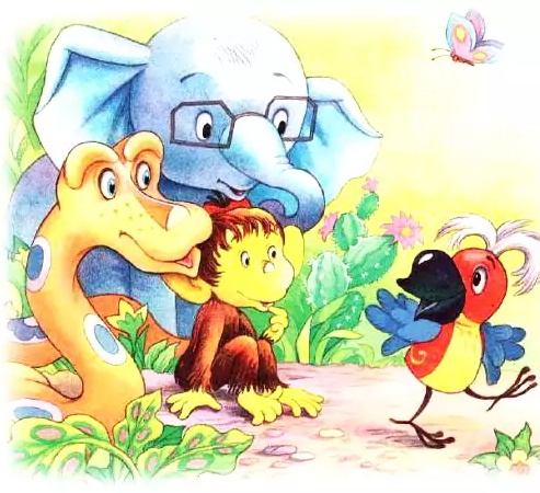 Как-то раз слонёнок, попугай, удав и мартышка сидели и разговаривали. Вдруг попугай встал на лапки и сказал: