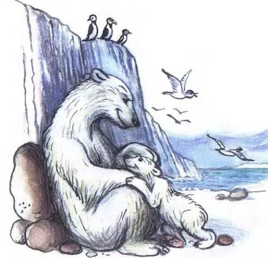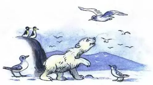 Ушла Большая Медведица, а Маленький Умка остался один и стал наблюдать за гагарами. Гагары сидели. Гагары кричали. Гагары летали над медвежонком. А он провожал их грустным взглядом, задрав к небу свою остроносую мордочку.
