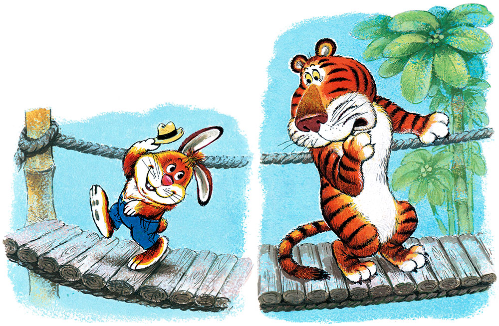 Но Кочерыжка даже ухом не повел, поздоровался и прошел мимо, как ни в чем не бывало. Медведь даже оторопел от неожиданности. В тот день кролик Кочерыжка столкнулся на подвесном мосту с Тигром.
