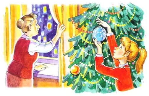 А ёлка становится все краше, блестят на ней сосульки, разноцветные бусы, жёлтые, красные, зелёные шары. Вот только один шарик уже пять раз падал с ёлки. И если бы не кошка — я забыла сказать, что под ёлкой сидела кошка, — он бы давно разбился. А кошка каждый раз ловила лапками падающий шарик, протягивала его маме и та снова вешала его на ёлкину ветку. А шарик был красивый: голубой с двумя снежинками на боку. Не с одной, как у других шариков, а именно с двумя. Одна снежинка была обыкновенная, а вторая — маленькая, но очень, очень серебристая.