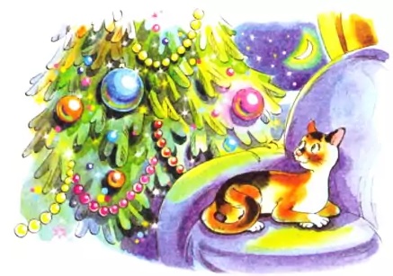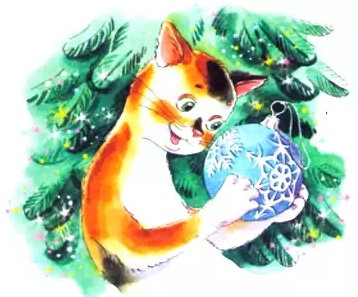 Кошка взяла голубой шарик двумя лапками, осторожно положила его на вату под ёлкой и спросила: