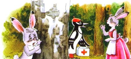 И вот врачи собрались. Местный врач-дятел разыскал главных знаменитостей: профессоров-филинов, желтоглазого и зеленоглазого, и главного ученого всех наук — летучую мышь. Врачи посоветовались, посовещались и сказали, что ничем, кроме травы неболейки, пыльцы цветка бо-лезабывайки, шляпки гриба болел-да-перестал, лечить зайчонка нельзя.