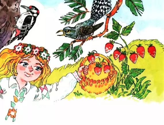 Задумалось Лето, глаза закрыло, а оттого звуки будто ярче стали. С одной стороны слышится кукушкин голос: «Ку-ку, ку-ку». Она, кажется, подсчитывает что-то. С другой стороны, с маленькой лесной речушки, доносится песня веселых лягушат. А прямо над головой Лета, на высокой елке. раздается звонкая дробь дятла.
