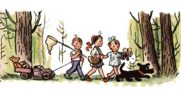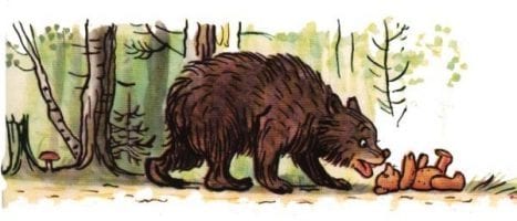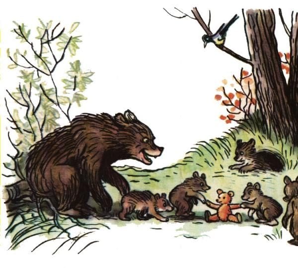 Сказка Сутеева «Находка» с картинками описывает судьбу плюшевой игрушки, обретшей новую семью. Плюшевого мишку, уходя в лес, дети взяли с собой (чтоб дома ему в одиночестве не заскучать). Но заторопившись, уходя обратно, забыли про своего любимца. Лежит мишка под деревом на спине – лапы кверху и молчит (он же плюшевый). Стали лесные жители медвежонка уговаривать поесть, разными дарами земли потчевать, а он опять-таки не отвечает…
